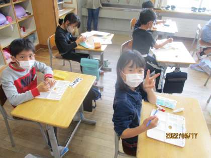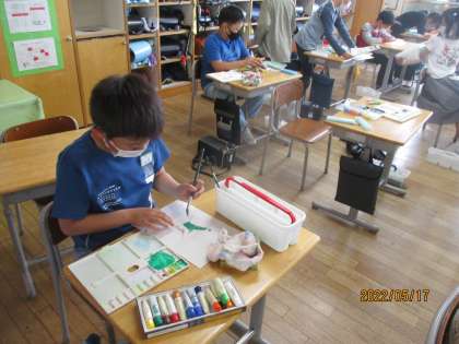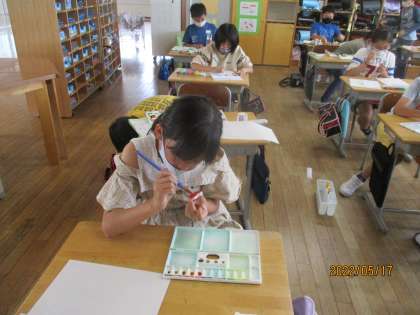 幻のたねに色をつけました。「幻」というキーワードからどんな色がよいか想像し、楽しみながら種をつくりました。子供たちは、「早く花を描きたい」と意欲を高めていました。