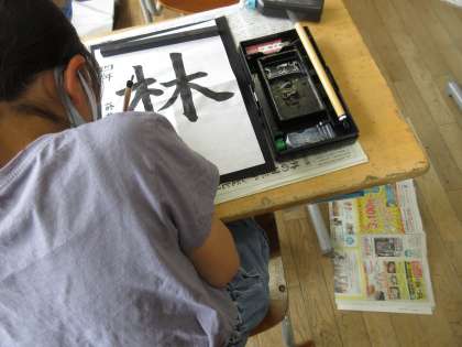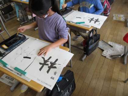 揮毫する際には、「きへん」と「木」がパズルのように組み合わさるイメージを大切にしました。また、横画を右上がりにすることや、前時に確認した「右はらい」「左はらい」のポイントにも気を付けて書くことができました。
