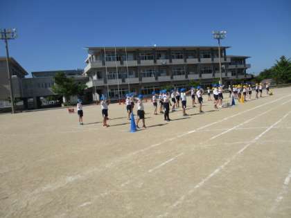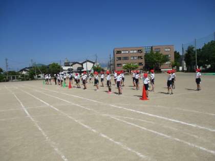 5年生は、自分たちの個人走後に、6年生の70m走の応援をします。今日は学年旗手のかけ声に合わせて、応援の練習をしました。本番は、心を一つにして応援もがんばります。