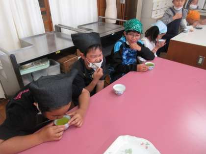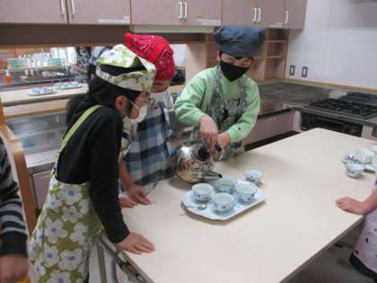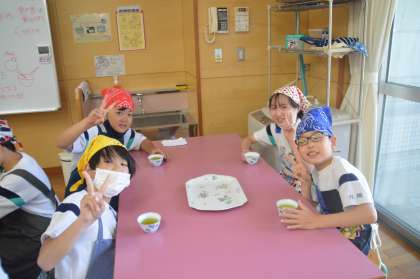 家庭科初の実習を行い、お茶入れを体験をしました!子供たちは、自分たちで入れたお茶を味わいながら飲んでいました!