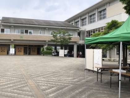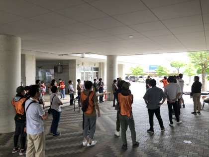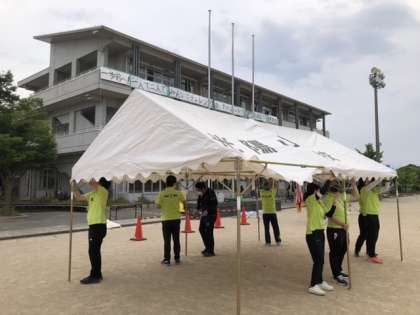 運動会には程よい感じの朝を迎えました。職員は早出で、会場準備を進めています。お父さんの会の方々も早速集合し、誘導・案内の打合せをしてくださっています。今日はよろしくお願いします。