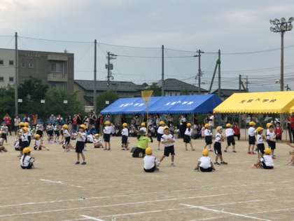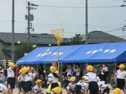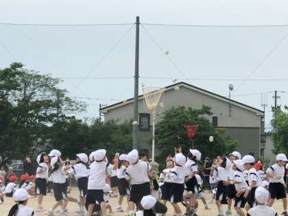 低学年の子供たちの団体競技です。音楽に合わせて踊り、合図とともに玉を投入します。