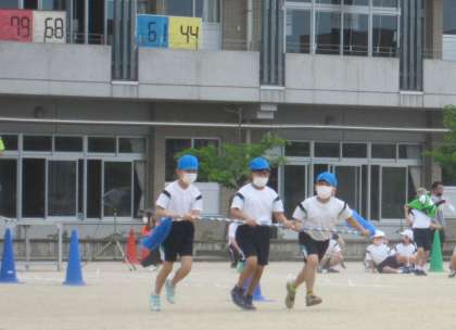 3年生は、「応援合戦」と「50m走」、「一人で二人でみんなで嵐を巻き起こせ」に参加しました。6年生の応援に背中を押され、激走しました。