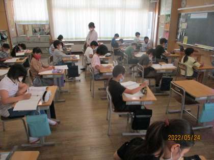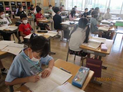 割り算の筆算の学習をしています。計算の方法が難しいですが、子供たちは、「たてる」「かける「うつす」「ひく」の順番に計算して覚えようとしています。これからが楽しみです。