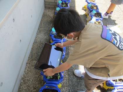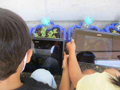 Chromebookを使った学習を始めています。今回は、生活科の学習であさがおの写真を撮りました。カメラ起動、写真撮影、撮った写真の確認方法等、ひとつひとつの動作を一緒に練習しました。