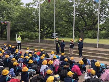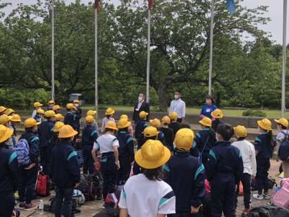 自然の家に着きました。二日間お世話になる所員の方々にご挨拶をします。進行役の子供たちがしっかりと式を進めています。