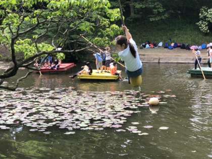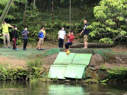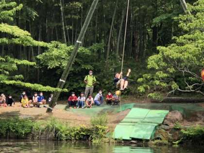 ロープにつかまって池へ。無事に戻れるよう真剣です。でも、このスリルが魅力なようです。