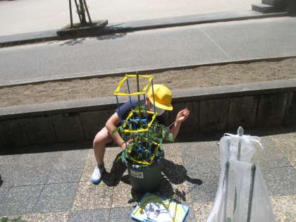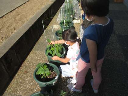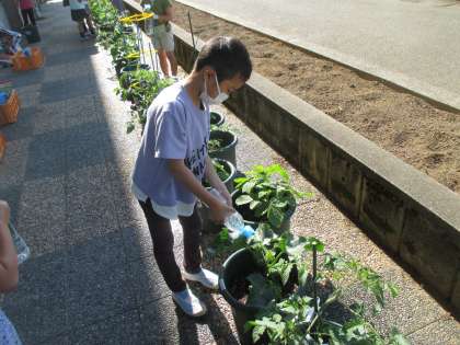 野菜のお世話を毎日頑張っています。朝や帰りの水やりはもちろんのこと、休み時間になるたびに様子を見に行ったり、水やりをしたりしています。支柱やネットをとり付けて、たくましく育っていくように工夫している子供も増えてきました。