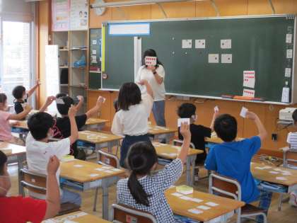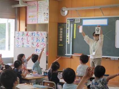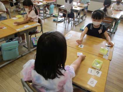 算数科では、「いくつといくつ」の練習をしたり、数の大きさくらべをしたりしています。ブロックや数カードを用いて、先生や友達と楽しみながら学習をしています。