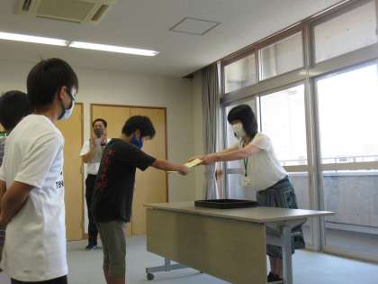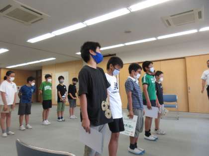 ドッジボール「富山県スポーツフェスタ第31回富山県民スポーツ・レクリエーション祭チャンピオンの部」で第3位に輝いた「光陽マーリンズ」のメンバーに、校長先生から賞状が手渡されました。