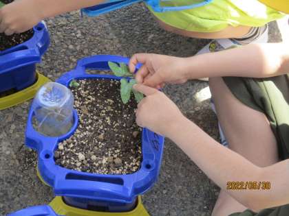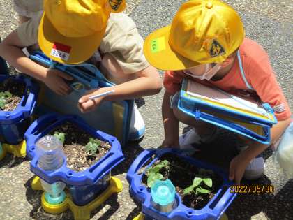 あさがおの芽が大きくなり、本葉が出始めました。子供たちは、「新しい葉っぱが出ているよ」「前とさわり心地が変わったよ」と、新しい発見に喜んだり、前回との違いに驚いたりしていました。
