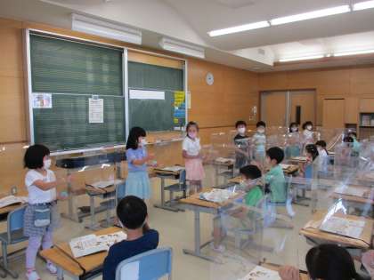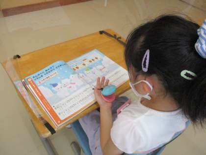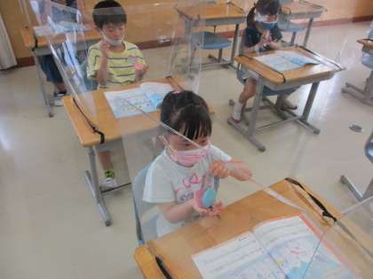 音楽科の学習では、音楽にあわせて手を叩いたり、楽器をならしたりしています。カスタネットを使って、リズムをうつ練習をしています。
