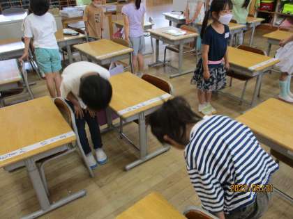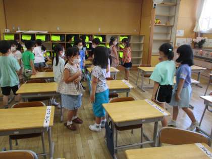 学級活動で、あいさつについて話し合いました。「元気なあいさつをしたら、元気パワーが伝わるよ」「目をみてあいさつされたら嬉しい気持ちになるよ」「○○さんのあいさつが素敵だから、真似したい!」など、あいさつ名人になるためにどんなことが大切かを語り合っていました。教室では、いろんな友達にあいさつをする練習をしました。