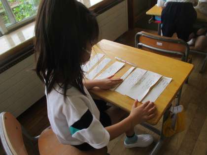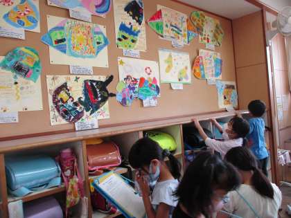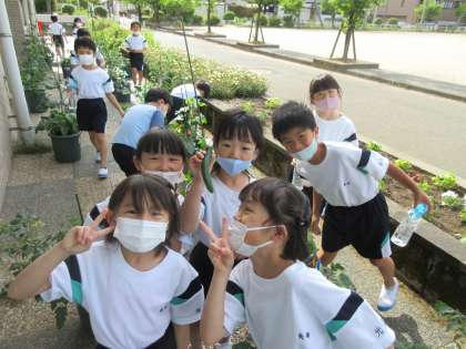 本日も蒸し暑い中でしたが、学習や運動を一生懸命行いました。写真は、図画工作で友達の作品を鑑賞している様子、国語の「たんぽぽのちえ」の文章を並べ替えている様子、生活科で育てている野菜を収穫した様子です。