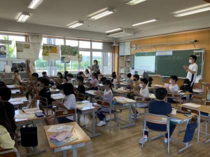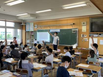 外国語活動では、1から20までの言い方に慣れ親しみ、数を尋ねたり答えたりする学習に取り組みました。後ろを向いて、楽しく歌っています。