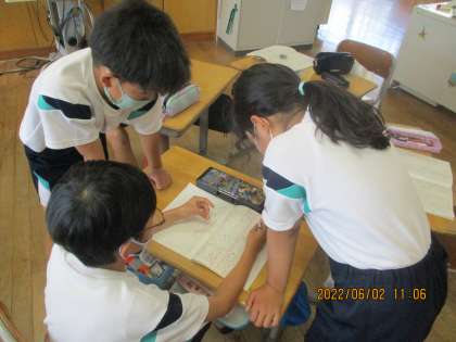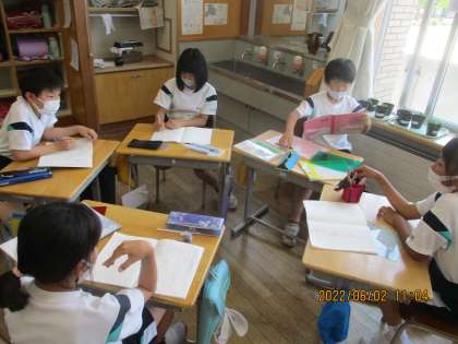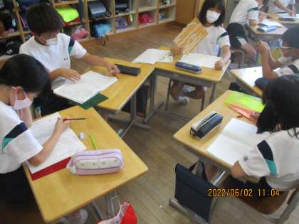宿泊学習で体験してきたことを新聞にまとめています。友達の素敵なところや心に残った瞬間を新聞にまとめようと、友達と文章を見合いました。