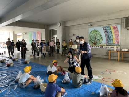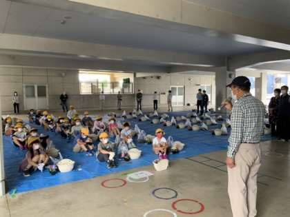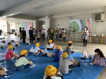 ふるさとづくり推進協議会の方からご挨拶と作業の仕方についてお話いただきました。子供たちは背筋を伸ばして聞いています。