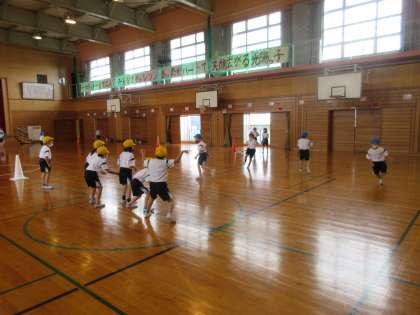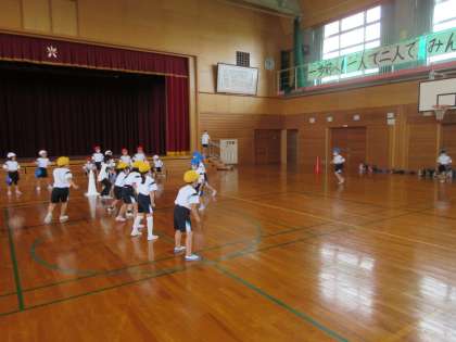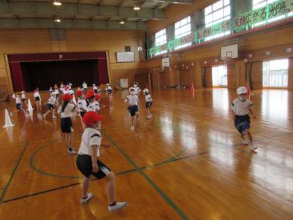 今日から2年生の体育では、「鬼ごっこ」をしています。ただの鬼ごっこではなく、攻めチームと守りチームに分かれて、守りの間を抜けて、何回突破できるか競うというものです。とても楽しみながら活動できました。