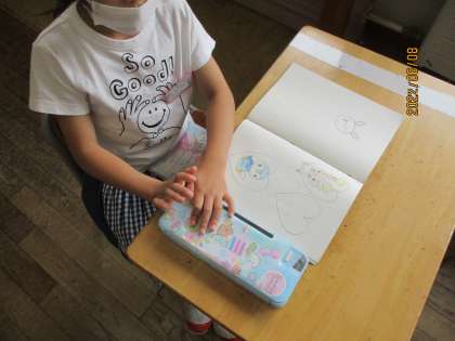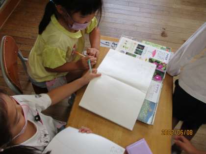 今日は、みんなが毎週楽しみにしているのびのびタイムでした。動画を見てダンスをしている子供、あさがおのことを調べている子供、ノートにイラストやひらがなをたくさん書いている子供など、みんなおもいおもいの時間を過ごしていました。