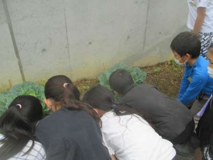 学校の花壇のキャベツに、モンシロチョウが卵を産み付けているのを発見しました。キャベツに付いている卵を実際に見て、子供たちはうれしそうにしていました。