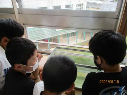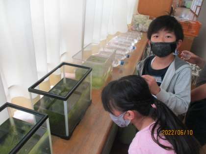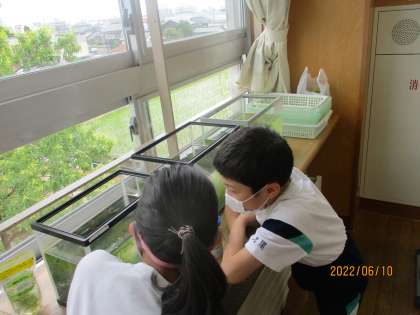 5年生のフロアでは、理科「魚のたんじょう」で学習するメダカを飼い始めました!子供たちは、興味津々にメダカを観察していました!