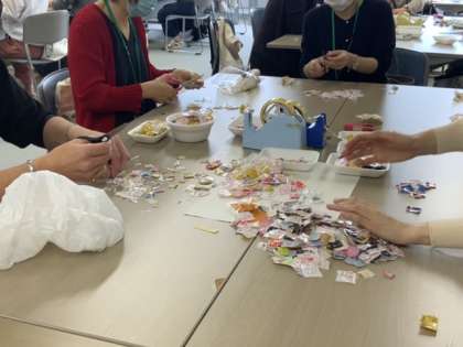 担当の方々が会議室に集まり、ベルマークの整理作業をしました。たくさん集まった1枚1枚を切り取り、分類していく作業は手間がかかります。PTAの皆様には、心から感謝です。