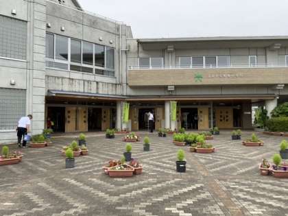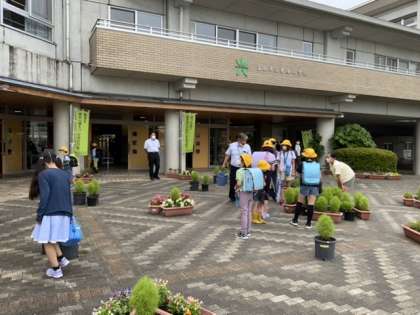 子供たちが登校してきました。玄関前のお花にびっくり!にっこり笑顔の子供たちです。さっそく担当の子供たちが水をあげたり、葉のお世話をしたりしてくれています。