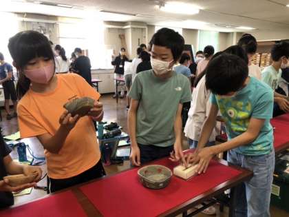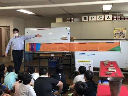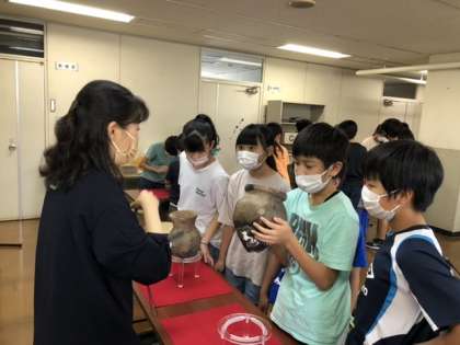 担当の方からそれぞれの時代の長さについて解説してもらいました。縄文時代の長さには子供たちはびっくりしていました。その後、実際に出土品に触れてみました。当時の物が自分の手の中にあることがとても不思議な思いになります。