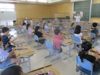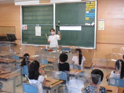 講師の先生に来ていただいて、リコーダーの種類や吹き方を教えていただきました。子供たちは、大小様々なリコーダーに驚いたり、先生のリーコーダーやフルートの演奏に感動したりしていました。