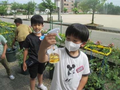 大事に育てている野菜が、どんどん実ってきています。30日間かけて作った手作りの虫除けスプレーを撒く子供がいるなど、野菜がよく育つようによく工夫しています。