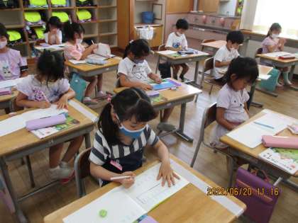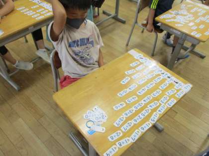 算数科の学習の様子です。たしざんカードを使ったり、ノートに式や答えを書く練習をしたりしています。繰り返し練習をして、たしざん名人になりましょう!
