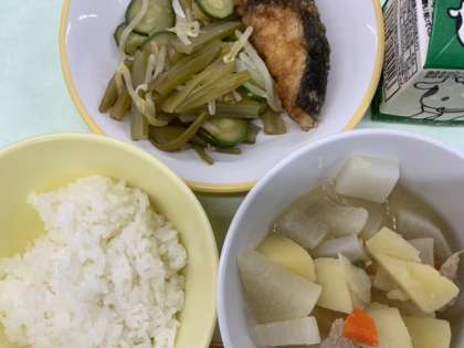 今日の給食は、よく噛んで食べることを意識できるよう、茎わかめ、こんにゃく、ごぼうなど、かみごたえのある食べ物が使われています。