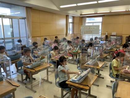 鍵盤ハーモニカで「カッコウ」に挑戦中。リズムがぴったりとそろっています。