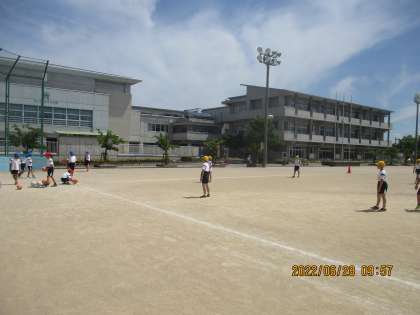 キックベースボールの学習をしています。相手チームの間を狙って素早いボールを蹴ったり、相手の頭上を狙ってボールを高く蹴ったりするなど、攻め方を工夫しました。よく考え、楽しみながら学習に取り組んでいます。