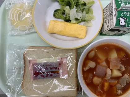 今日は、トマトの味を生かした煮込み料理です。野菜もたっぷりで栄養満点です。味わっていただきます。