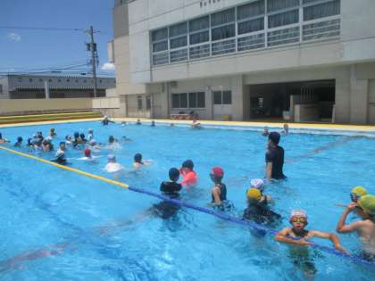 今年度初めてのプール学習に、子供たちは大喜びでした。水中じゃんけんをしたり、みんなで回転して渦をつくったりして、楽しみました。