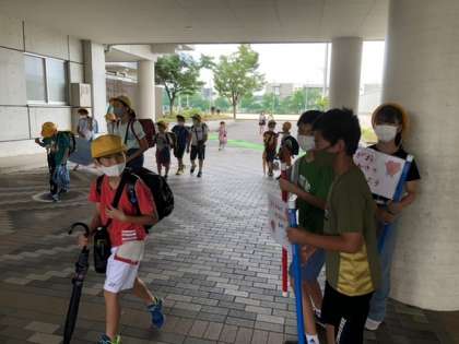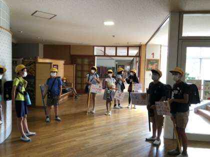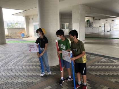おはようございます。昨日は、すごい大雨の中での登校でしたが、今朝はおだやかな朝を迎えました。あいさつ運動の子供たちが啓発のための旗を掲げながら、あいさつを呼びかけています。