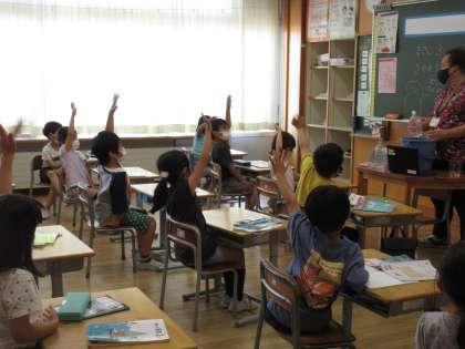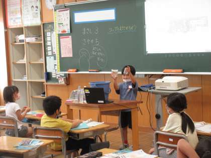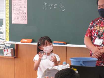 実際に2本のペットボトルの水のかさを比べてみせると、「コップの大きさが違うよ!」「それでは比べられないよ。」等と口々につぶやく子供たち。