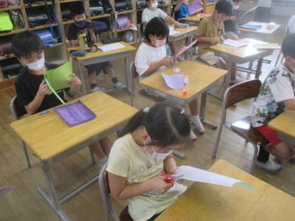 図画工作科の学習で、アジサイの絵をつくっています。水彩で色を塗った画用紙を細かく切って、アジサイの花びらをつくりました。