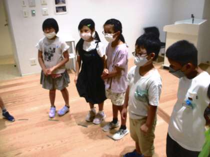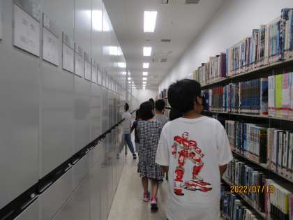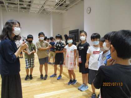 「ガラスなのにおかしみたいな作品だな」「こんなふうに本を収納していたんだ」など子供たちは目を輝かせながら、ガラス作品や普段は見ることができない図書館の裏側を見学しました。とてもよい体験ができましたね。