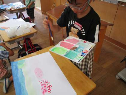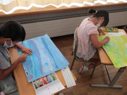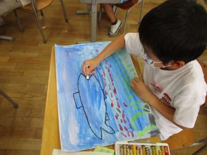 心に残った場面について想像を膨らませながら、水彩絵の具とクレヨンを使ってスイミーの世界を描きました。