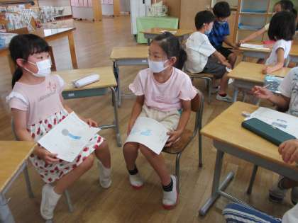 子供たちは自分が考えた道具を友達に紹介したり、友達の発明した道具について「いいね」「おもしろい」と楽しんで聞いたりしていました。