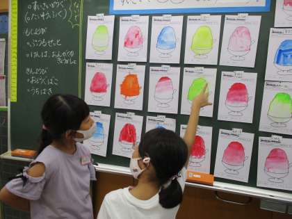 図画工作科「すいさいとなかよし」の学習では、かきごおりを描きました。おいしそうなかきごおりがたくさんできました!