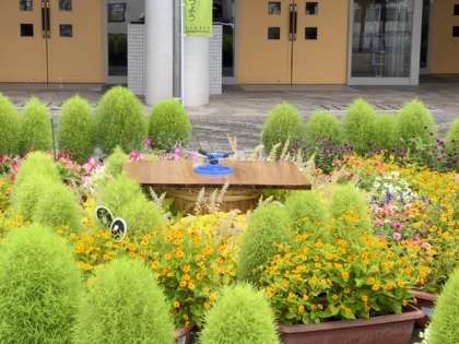 おはようございます。にこさわで広場では、朝からスプリンクラーが一生懸命働いてくれています。お花たちを守ってくれています。
