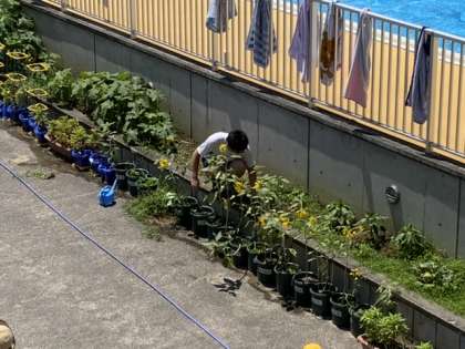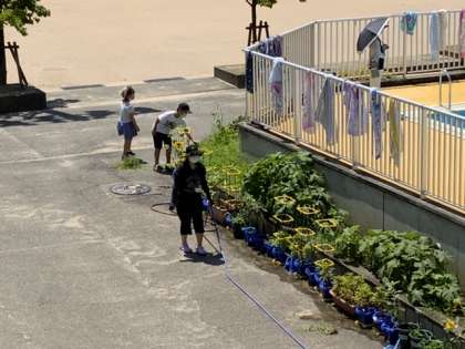 プールの歓声を聞きながら、花壇の草むしりをしている教員の姿が。子供たちも手伝ってくれています。