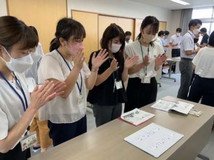 午後からたくさんの教員が来校して研修会をしました。1小節のリズムカードを並べて、短い音楽をつくっています。