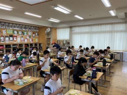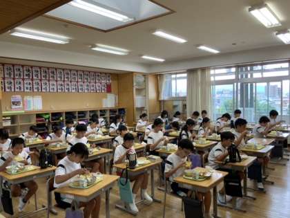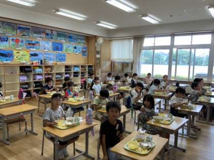 久しぶりの給食に子供たちの期待も大です。その美味しさを十分に味わいながら、いただいています。食事中はマスクを外しますので、黙食を続けています。