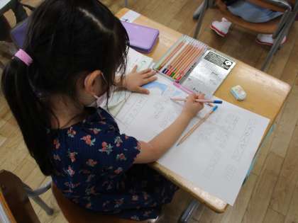 国語科の学習では、「いちねんせいのうた」を音読したり、視写したりしました。今日は天気がよく、青空が見えました。子供たちは空に向かって音読を楽しみました。