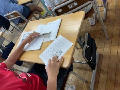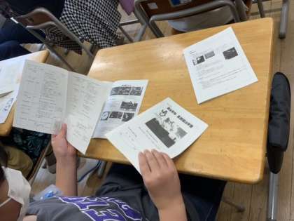 集団宿泊学習のしおりを配付しました。コンパクトなA4サイズの半分折りです。ステープラーで綴じて製本完了です。