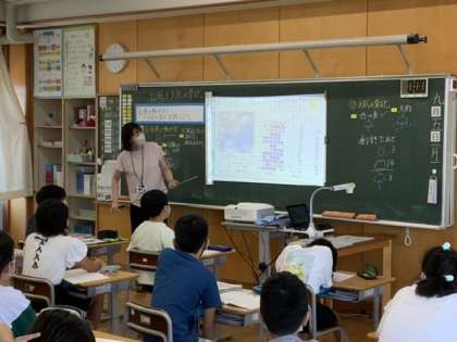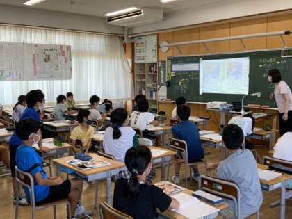 理科の学習では、新聞の気象予報の記事を使って考えました。2日分の新聞を比較することで、状況の変化が明らかになります。「台風の大きさが変わっている!」子供の発言です。